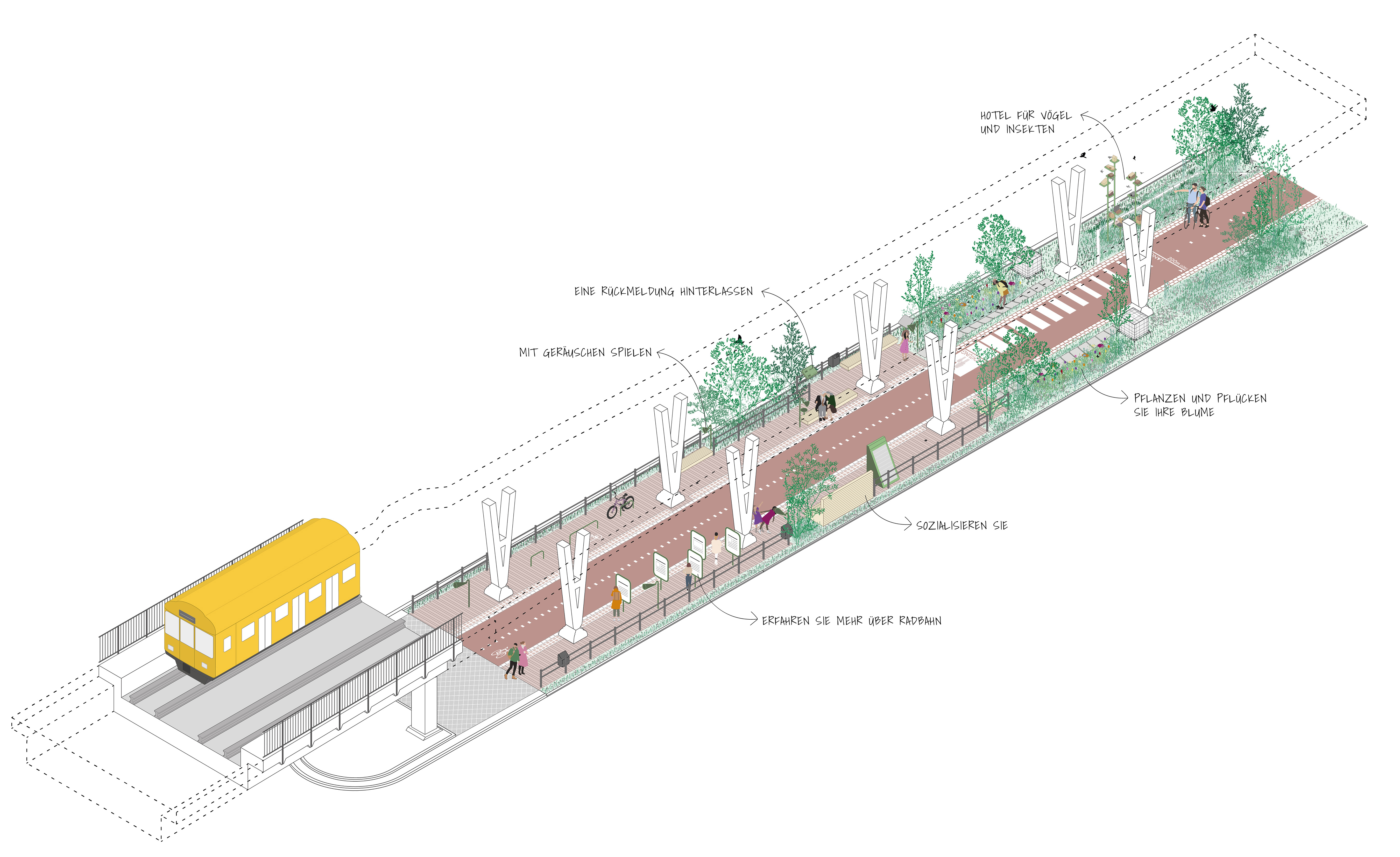 Intelligente Infrastruktur: Interaktive Objekte wie Bänke, Klanginstallationen und Informationssysteme führen zu Aneignung des öffentlichen Raumes. Die Radbahn ist nicht nur ein Stadterneuerungsprojekt, sondern eine Vision, die Mobilität, Ökologie und Sozialität in einem innovativen Raum vereint.