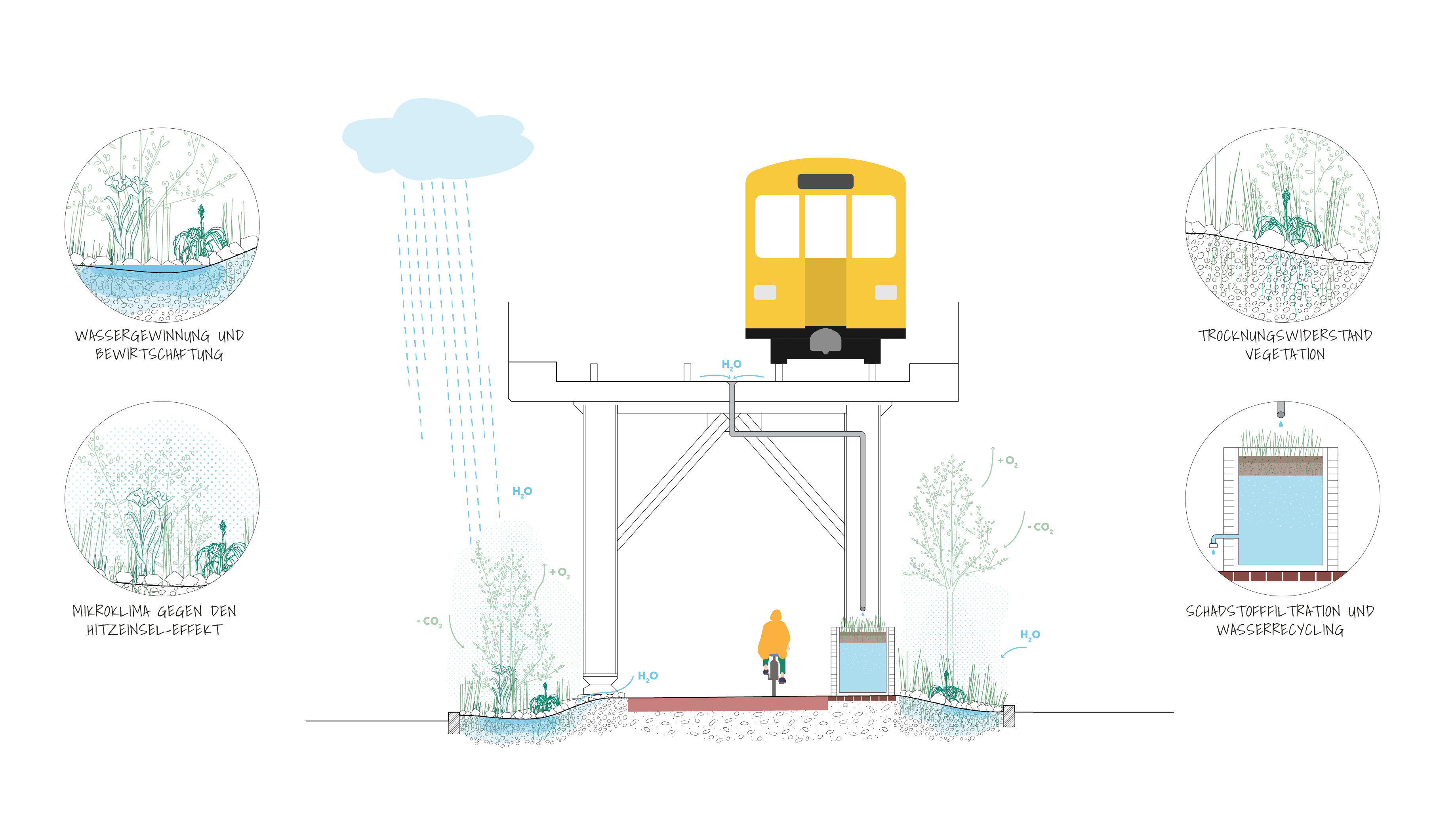 Wassermanagement: Die Pflanzflächen sind so konzipiert, dass sie das Regenwasser zurückhalten, um das Mikroklima zu mildern und das Pflanzenwachstum in Trockenperioden zu unterstützen. Aufgrund der Dachwirkung des Viaduktes und des hohen Trockenheitsrisikos, wurde das Gelände so modelliert, dass das Regenwasser in die gemuldeten Bereiche unter das Dach geleitet wird. Außerdem wurde in Zusammenarbeit mit der TU Berlin ein Filterbeet installiert, das mit Hilfe von Pflanzen und Substraten das zur Verfügung stehende Regenwasser vom Viadukt reinigen soll. Derzeit wird die Qualität dieses gefilterten Wassers überwacht und untersucht, ob dieses Wassers für die Bewässerung geeignet ist.